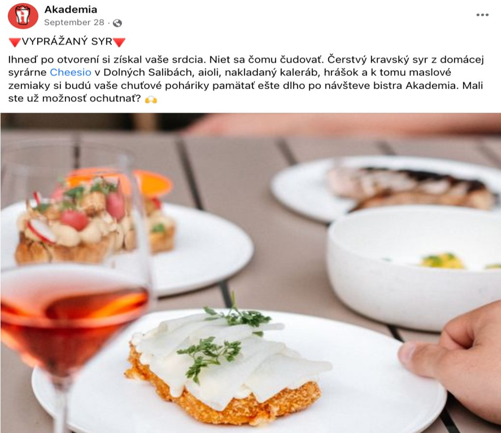 Přestože se za vizuální sociální sítě považují zejména Instagram nebo TikTok, i na Facebooku je potřeba se prezentovat kvalitním vizuálním obsahem. Pokrmy a drinky by měly být profesionálně nafoceny nebo natočeny, s čímž vám může pomoci šikovný freelancer, reklamní agentura nebo někdo z vašeho personálu. Dnešní mobilní telefony jsou totiž schopné pořídit velmi kvalitní snímky i videa – na vás tak zůstává zajistit dostatečné světlo a zajímavou kompozici.
