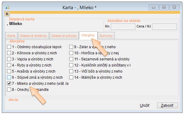 - Na skladových kartách mať vyplnené alergény - v zozname skladových kariet, je potrebné na skladovej karte v záložke Alergény nastaviť, o aký alergén sa jedná.