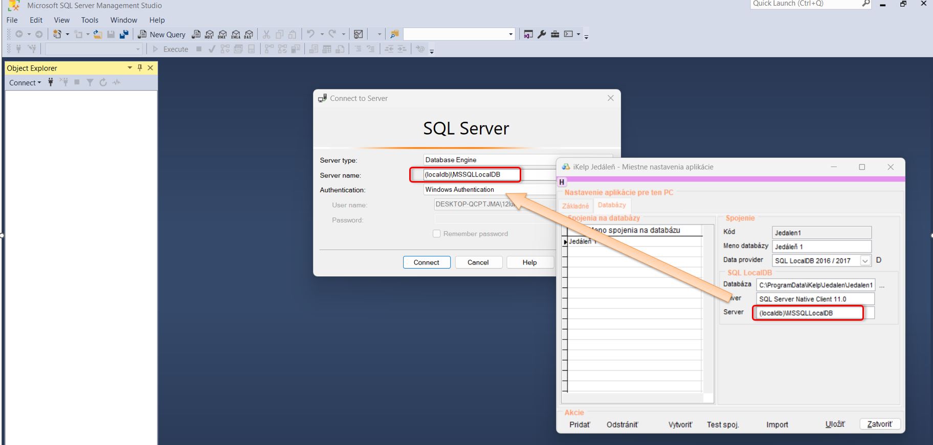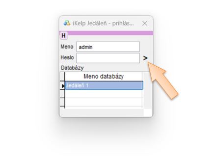 2. V prihlasovacom okne aplikácie nastavte napojenie na databázový server. (Do poľa Server name, zadajte údaje z poľa Server aplikácie Jedáleň.)