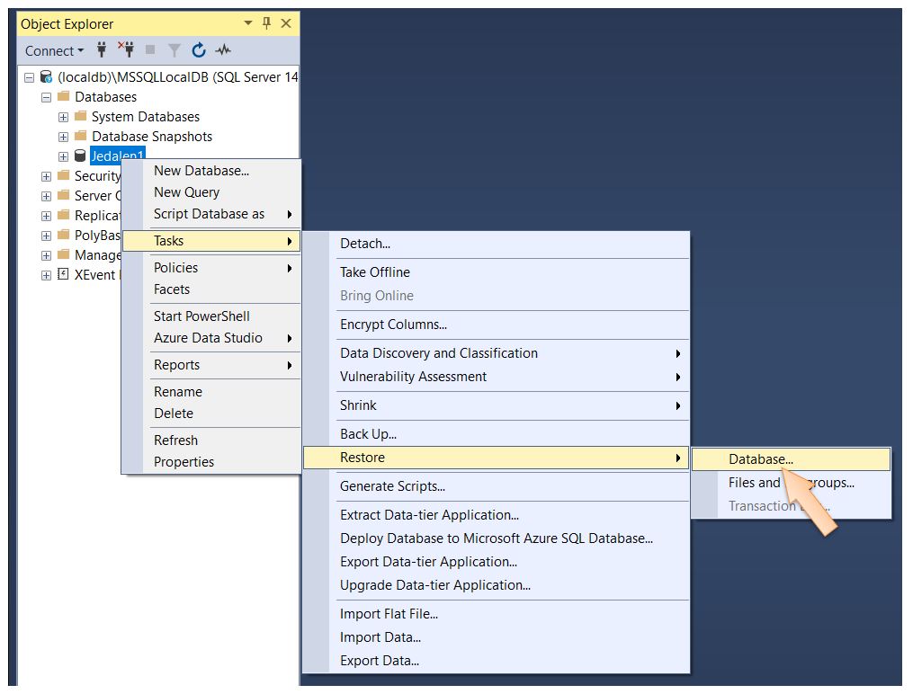 3. Prejdite myšou na možnosti Tasks - Restore a kliknite na Database...