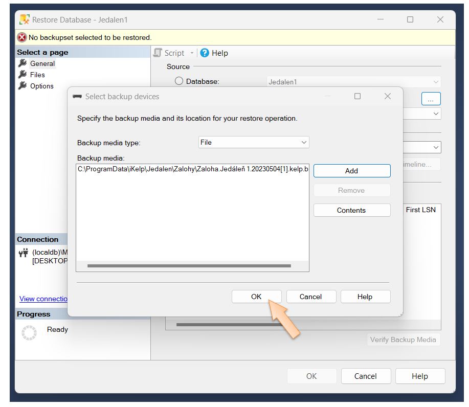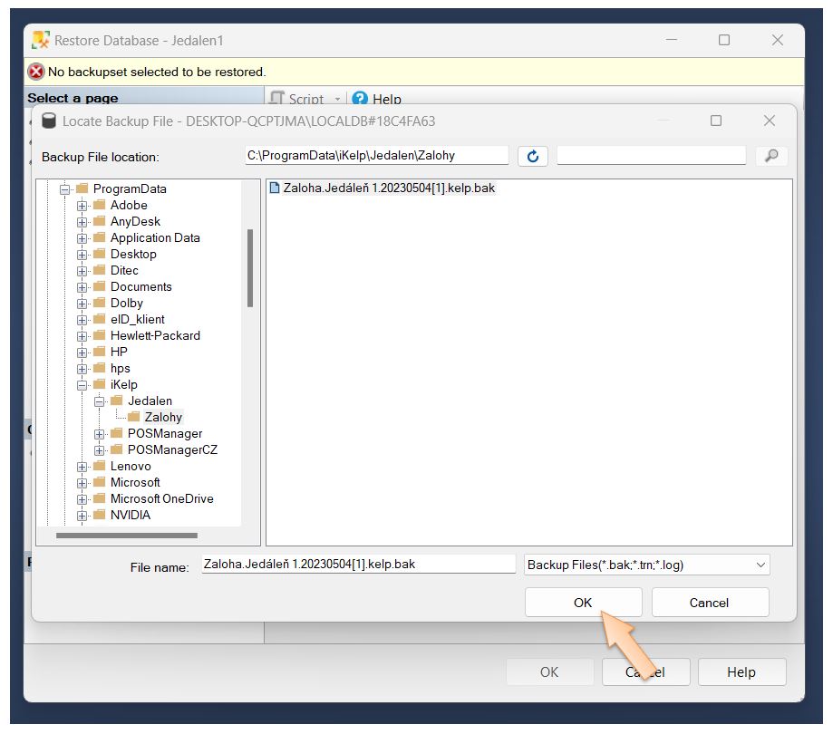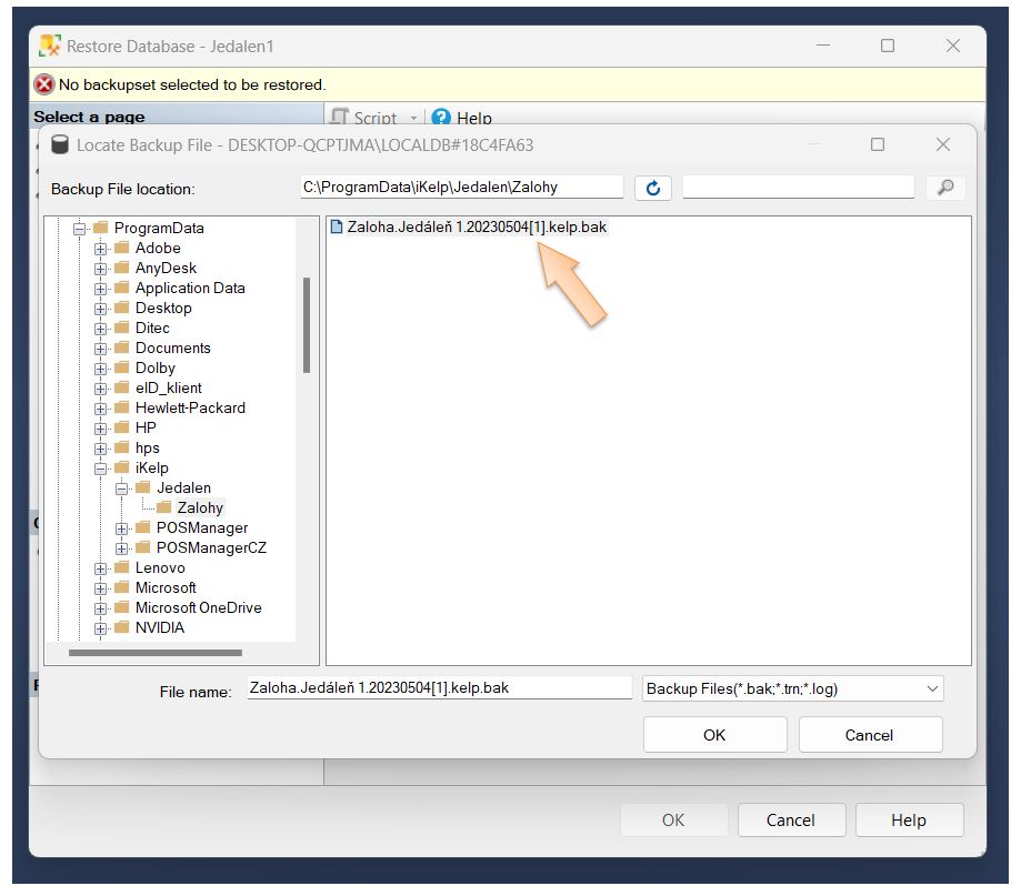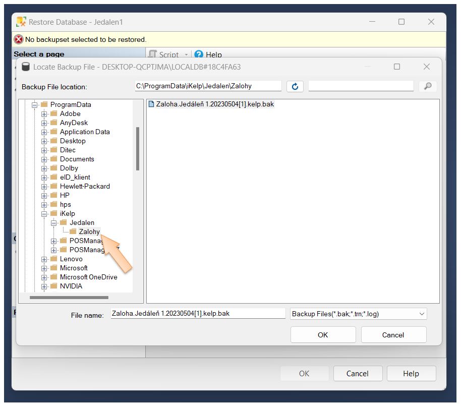 Obnova databázy zo zálohy v iKelp Jedáleň Ex