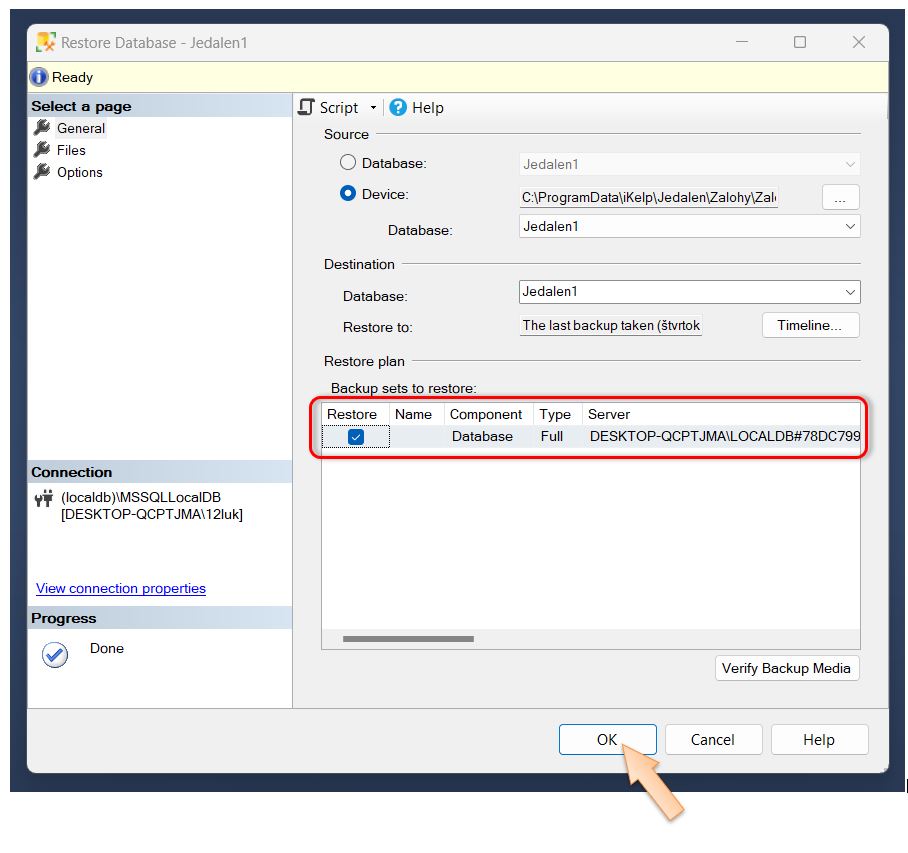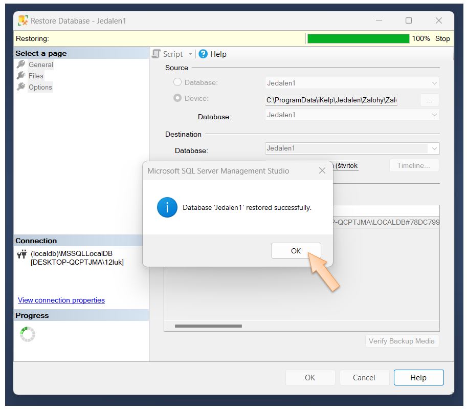 8. Kliknite na OK v časti Restore Database čím potvrdíte obnovenie zo zálohy.