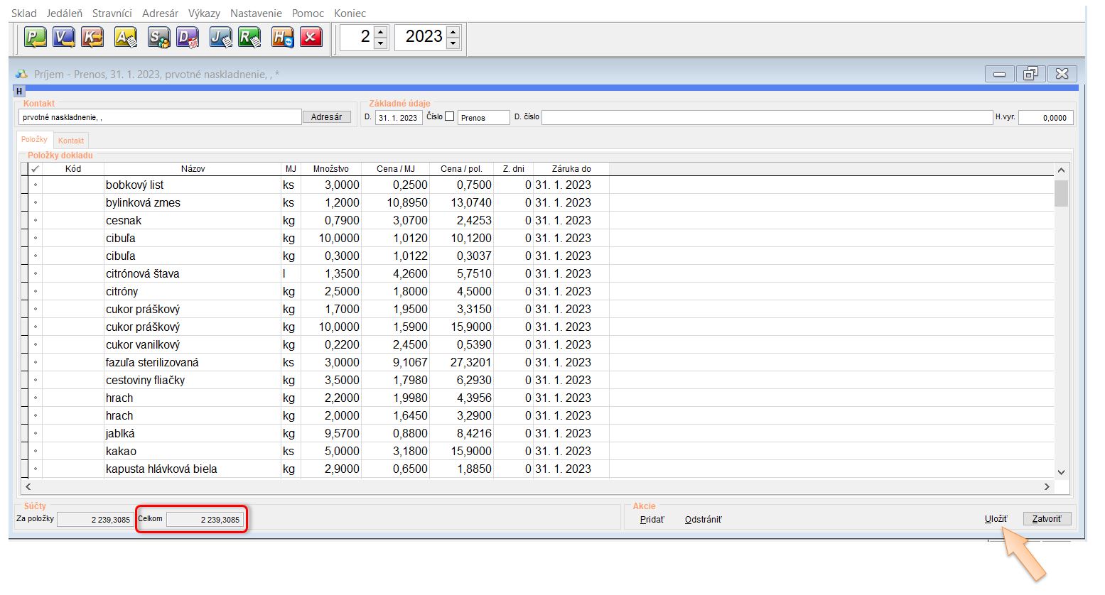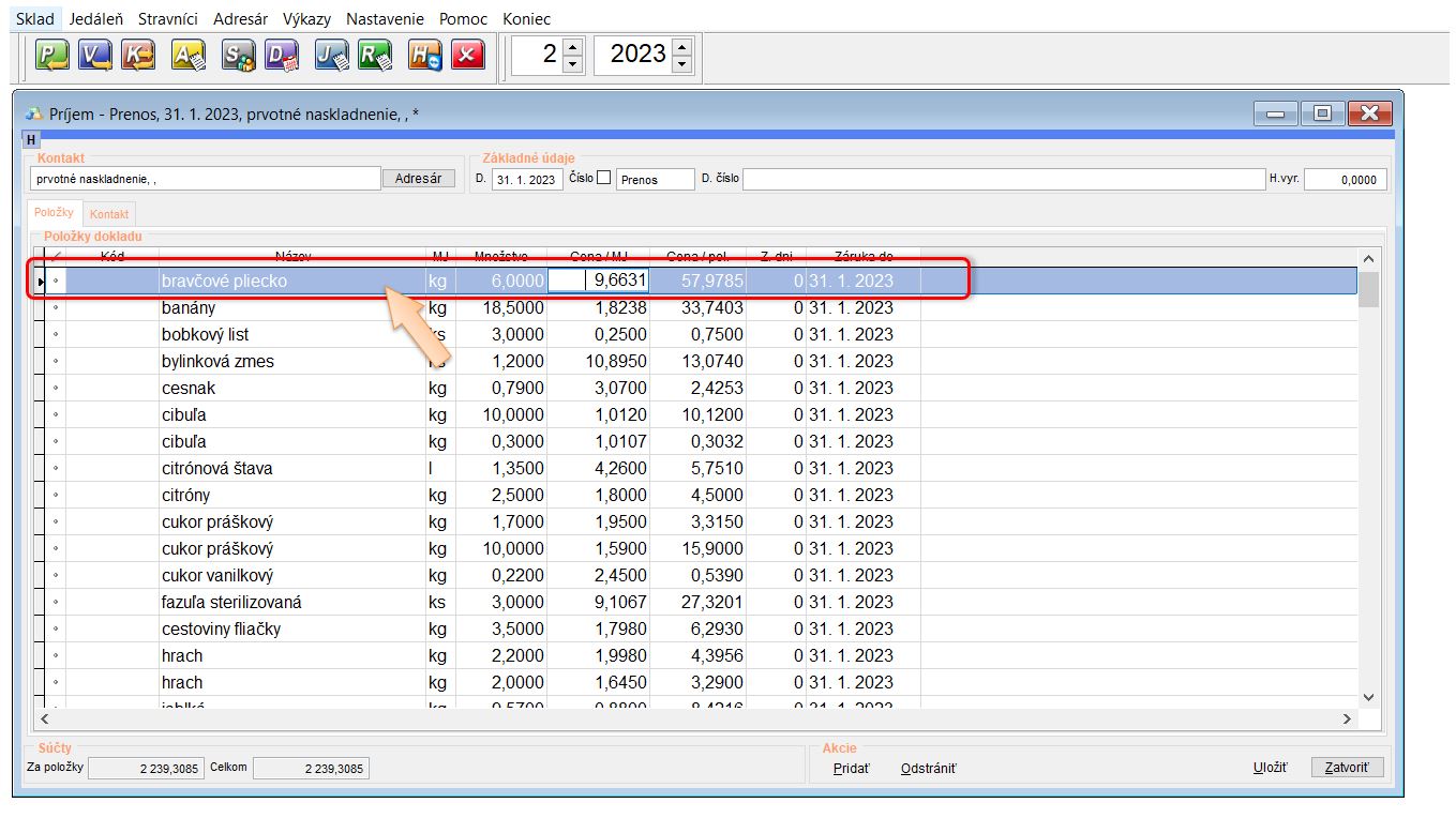 - Skladové zásoby - na základe poslednej obratovej súpisky sa prenášajú zostatky skladu ako počiatočný príjem. (Tento príjem je evidovaný k danému, alebo predchádzajúcemu mesiacu, v ktorom bola vytvorená pôvodná obratová súpiska.)