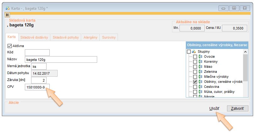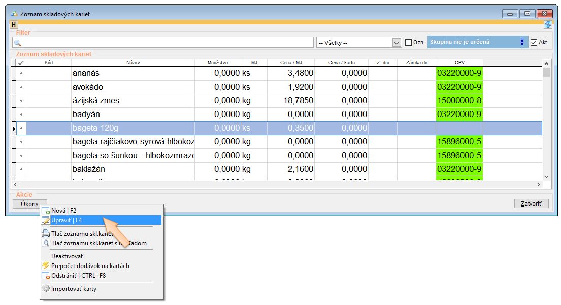 - Nájdite si v zozname skladových kariet kartu, ktorá nemá zadaný kód v stĺpci CPV a danú kartu si otvorte na úpravu.