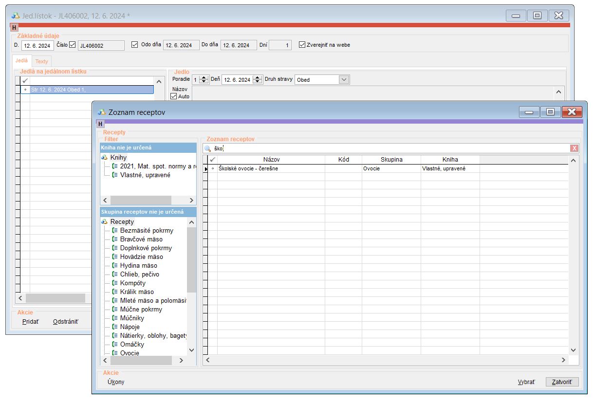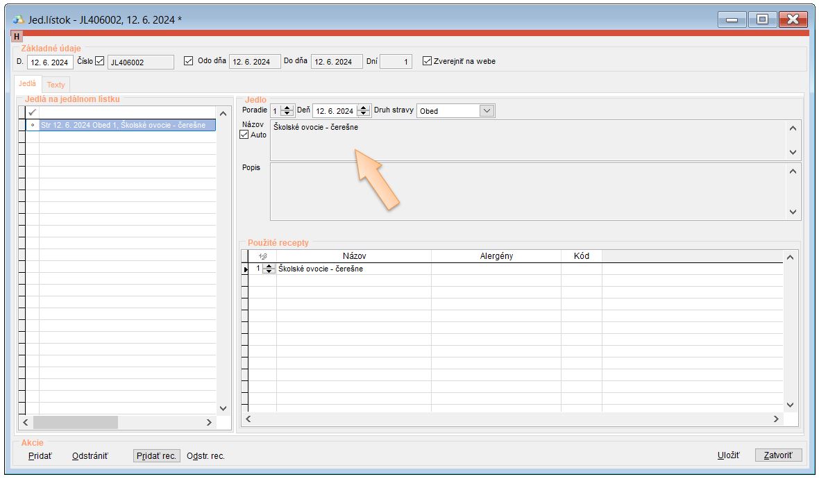 Vytvorenie karty receptúry pre výber na jedálny lístok