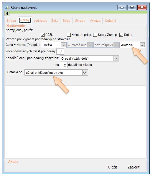 - V časti Dotácia sa nastavte aplikovanie už pri prihlásení na stravu. (V tomto prípade systém aplikuje poplatok za stravu s aplikovaním dotácie pri prihlásení. Následne je možné definovať, na ktoré dni stravník nemá nárok na dotáciu a bude mu tak počítaná celková cena stravného.)