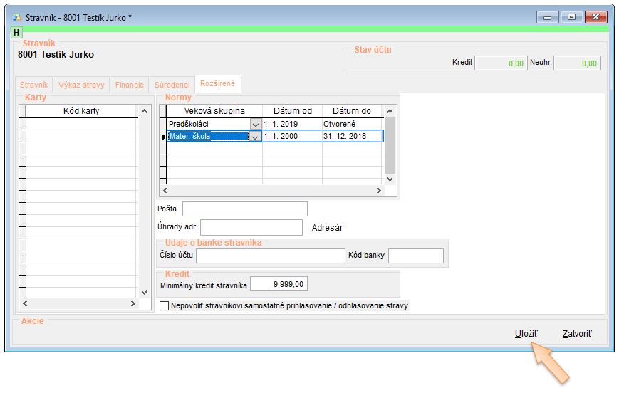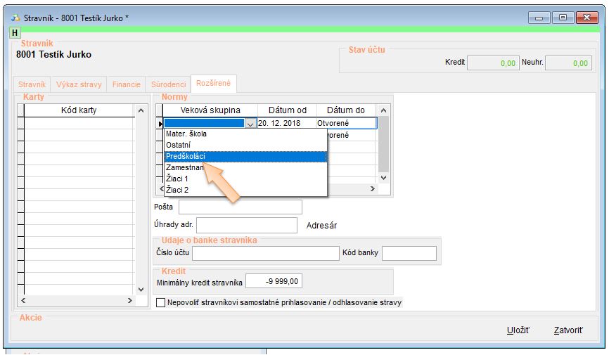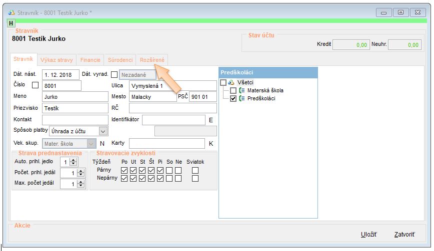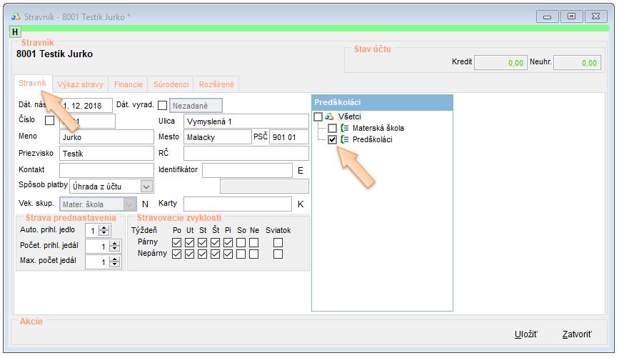 - V záložke Stravník zaraďte stravníka do skupiny Predškoláci.