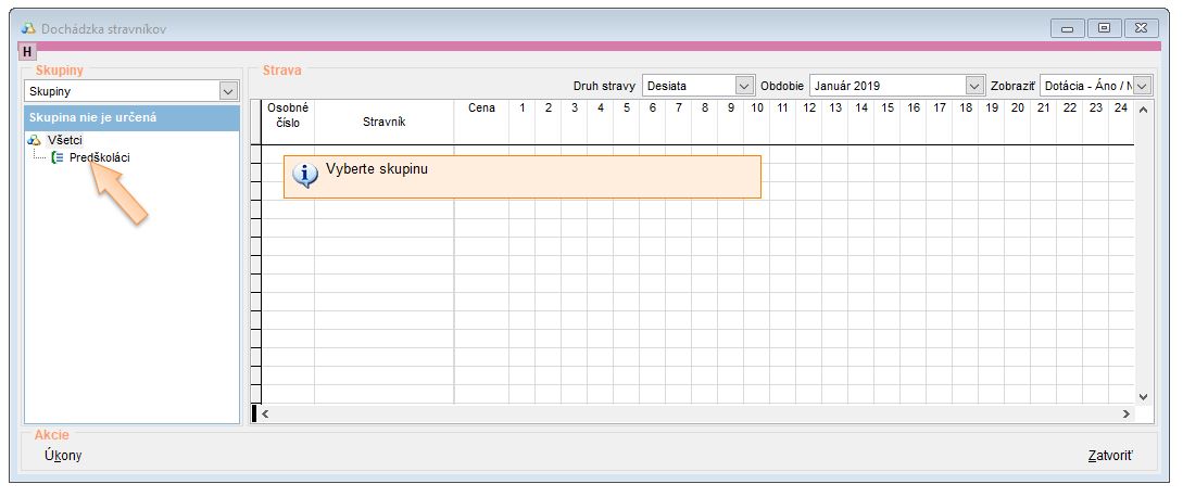- Otvorte si dochádzku stravníkov. (Tlačidlo D na nástrojovej lište.)