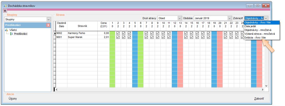 - Na dni, ktoré sú označené v zozname fajkou, stravníkovi je aplikovaná dotácia. (Ak sa v niektorom dni fajka nenachádza, stravník na tento deň nie je prihlásený, alebo nemá nárok na dotáciu.)s