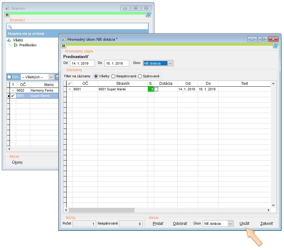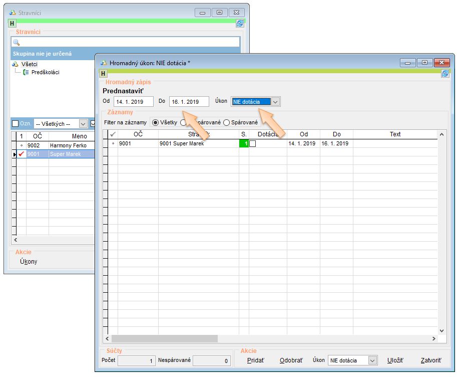 - Nastavte úkon NIE dotácia pre zrušenie dotácie vybraných stravníkov.