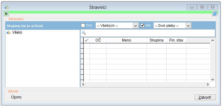 Okno stravníkov zobrazíte po kliknutí na Stravníci v hlavnom menu (alebo na tlačidlo s písmenom S na nástrojovej lište). V tomto okne je možné vytvárať nových stravníkov alebo upravovať stávajúcich, vytvárať a prideľovať skupiny stravníkov.