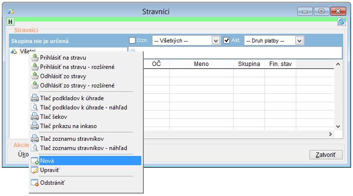 • Nového stravníka vytvoríte kliknutím na tlačidlo Úkony a Nový, alebo kliknutím pravým tlačidlom do zoznamu stravníkov a následne výberom možbosti na Nový.