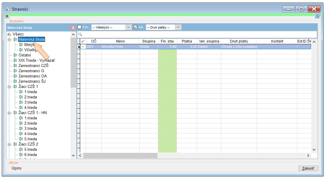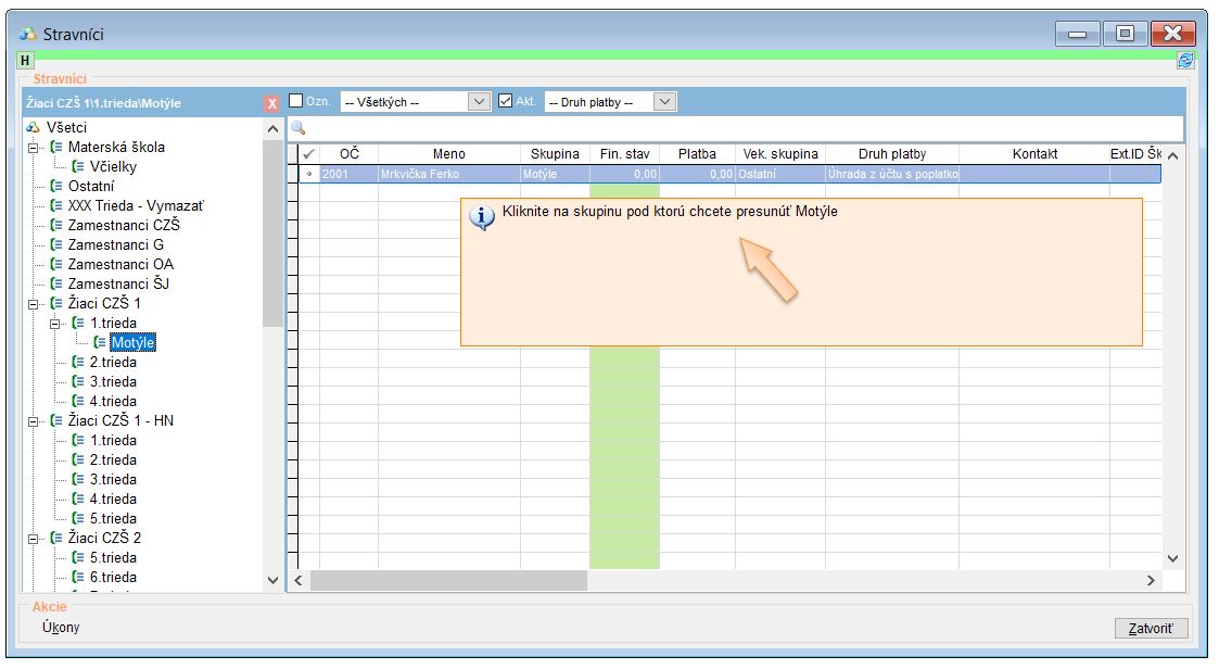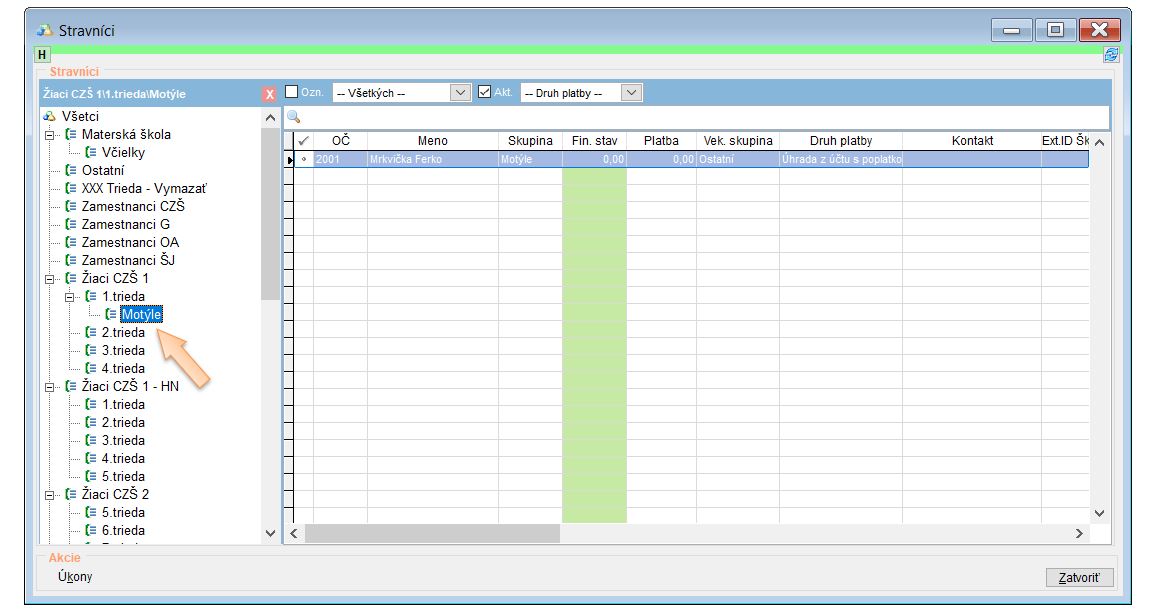 Ak sa vám pri práci stalo, že sa premiešali skupiny stravníkov (napr. skupina Motýle (trieda z MŠ) sa premiešali so skupinou stravníkov z Žiaci 1) nevadí. V tomto návode nájdete postup, ako túto sitáciu riešiť. Stravníci stále zostávajú zaradený v príslušných skupinách, takže k ich premiešaniu reálne nedošlo. Len v zozname stravníkov sa zobrazujú spoločne, pretože ak sa pozeráte na jednu skupinu, vidíte aj stravníkov z podskupiny.