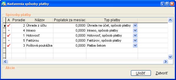 Predvolene sú v aplikácii aktívne všetky spôsoby platby. V stĺpci A (Aktivita) môžete zapínať a vypínať zaškrtávaním políčka aktivitu danému spôsobu platby. Všetkým spôsobom platby môžete meniť Názov, Typ platby a dokonca aj zadefinovať Poplatok za mesiac, ktorý sa automaticky pripočíta k hradenej sume.