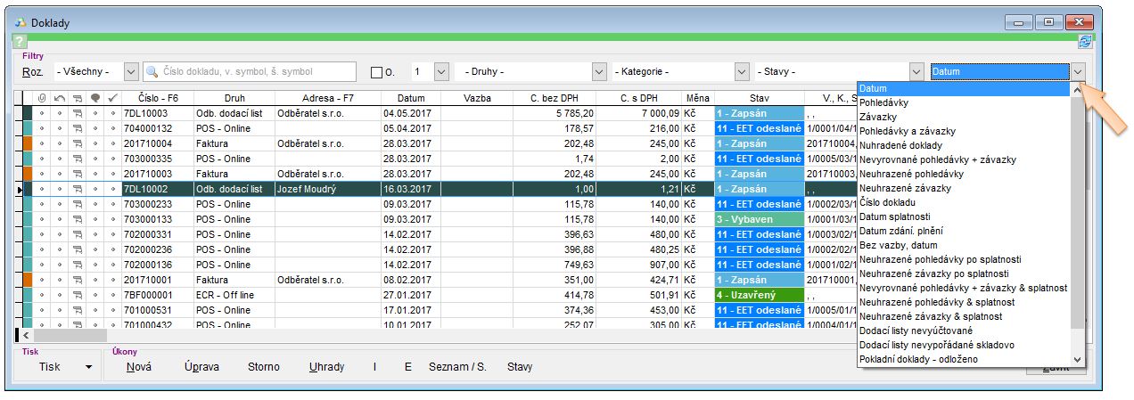 • -- Druhy --- filtrování na konkrétní druh dokladů. Tímto filtrem je možné zobrazit jen doklady prodané přes online zařízení, případně jen dodací listy, faktury apod.