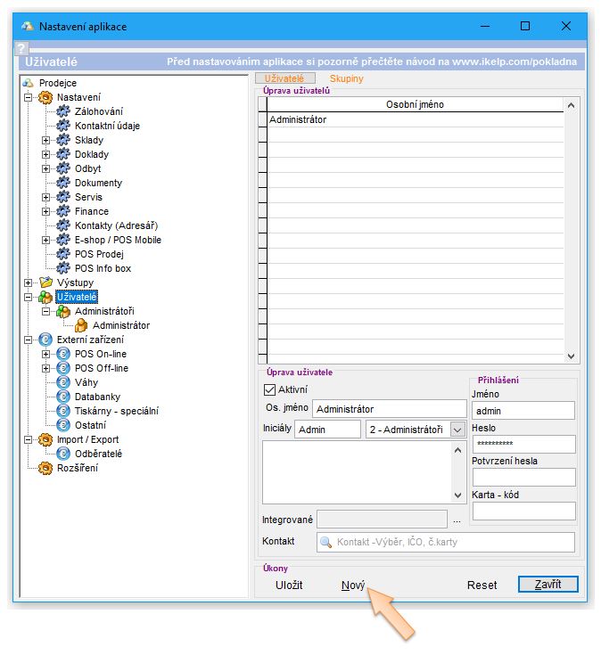 - V záložce Uživatelé klikněte na tlačítko Nový, pro vytvoření nového uživatele.