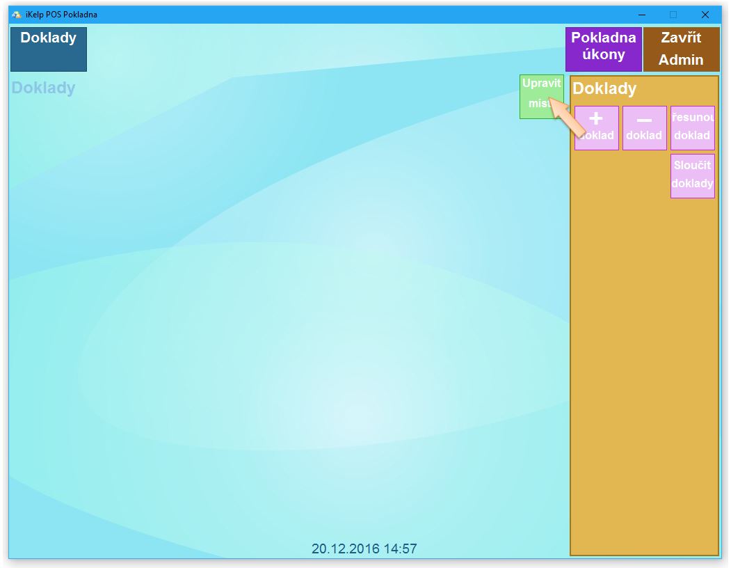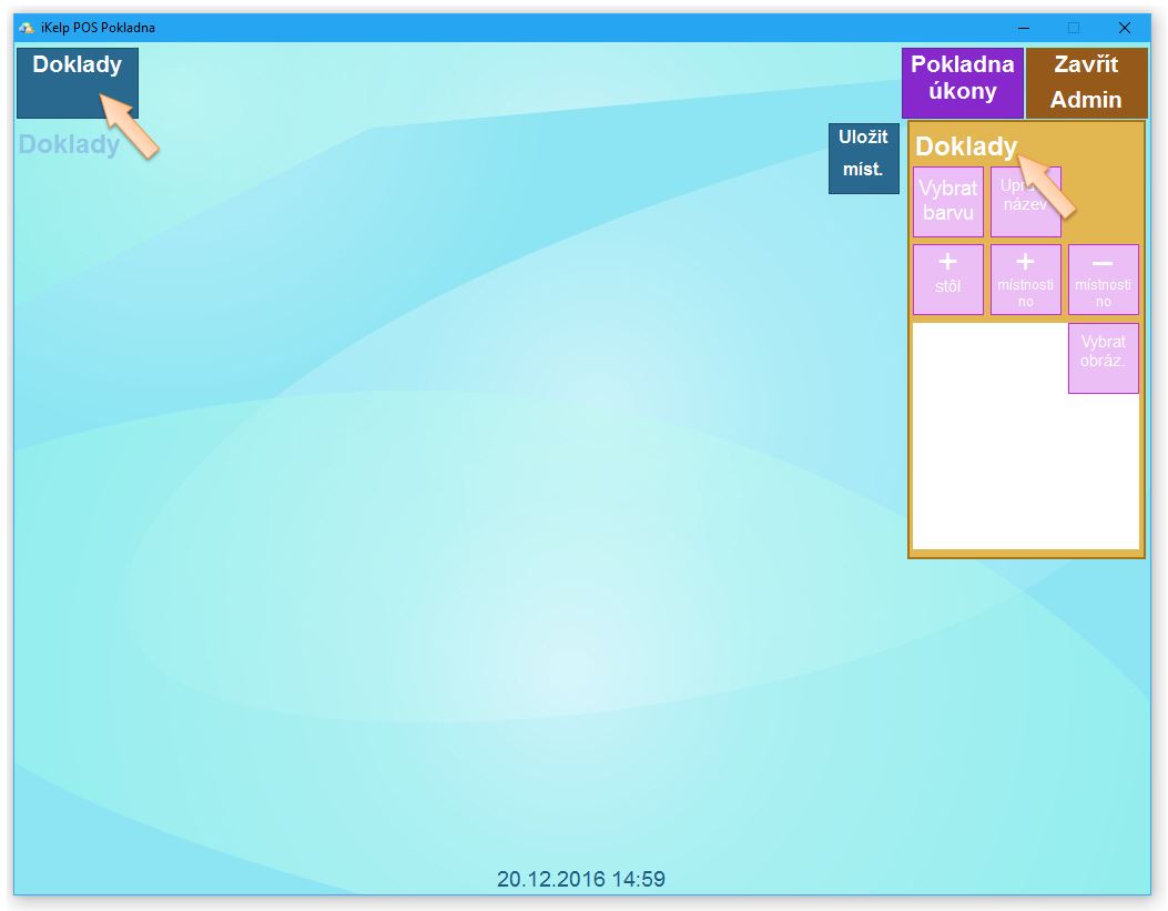Pro konfiguraci daných nastavení v aplikaci si spusťte dotykové rozhraní prodeje v aplikaci. Po inatalaci je vytvořena místnost s názvem Doklady. Tento název doporučujeme změnit, následně je možné vytvořit si další místnost, případně nadefinovat stoly v místnostech.
