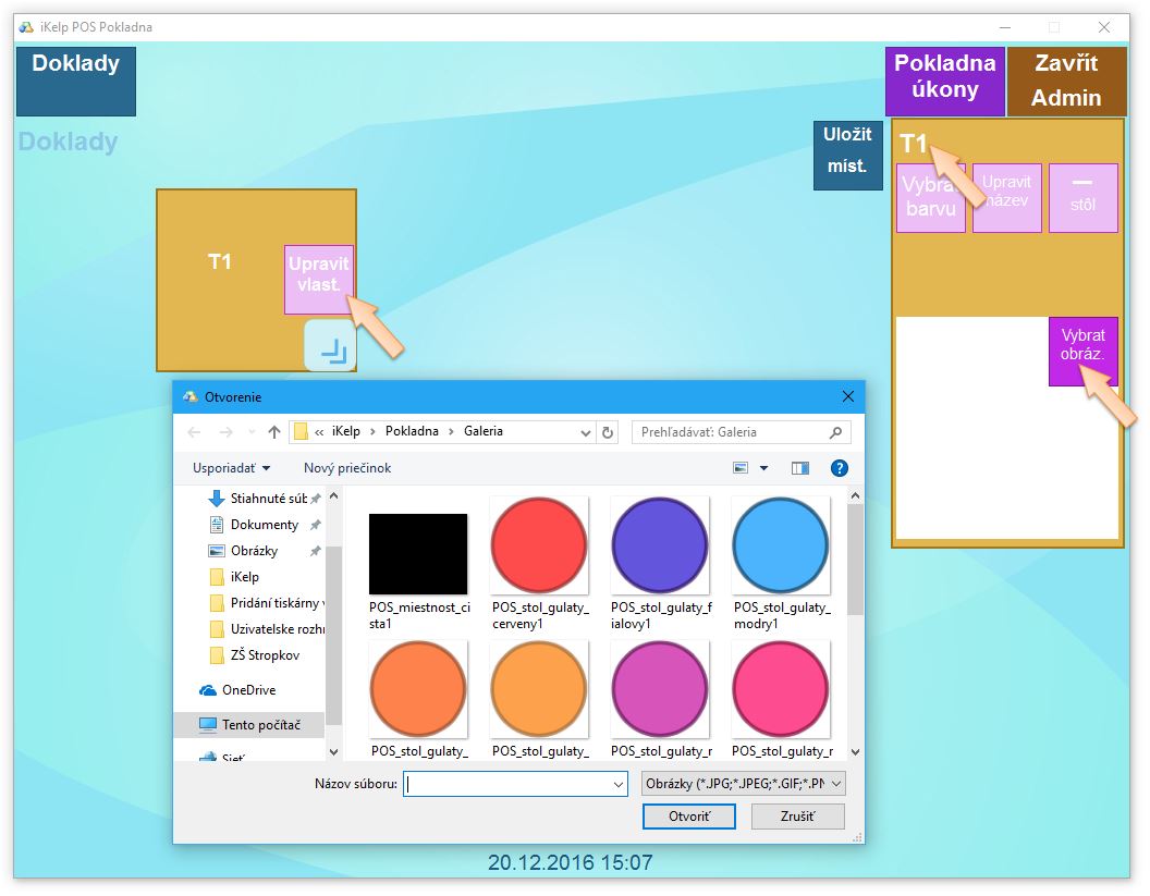 - Vybrat obráz. - kliknutím na tlačítko je možné jako už bylo výše vzpomenuto vybrat obrázek místnosti z předdefinované galerie různých tvarů a barev stolů. Rovněž je možné vytvořit si i vlastní obrázek stolů, aby se zobrazení blíže podobalo provozu a následně je možné si vybrat i z těchto obrázků.