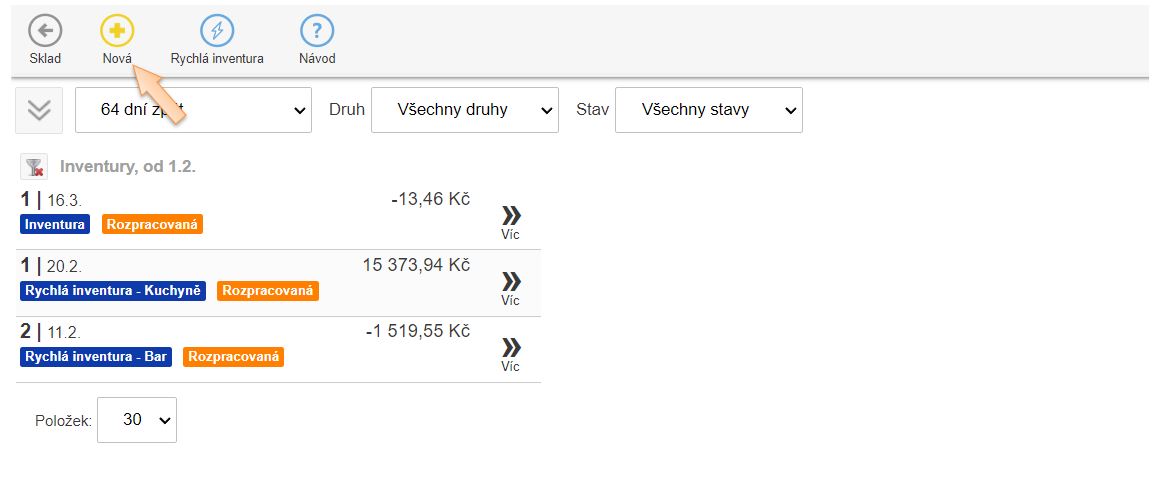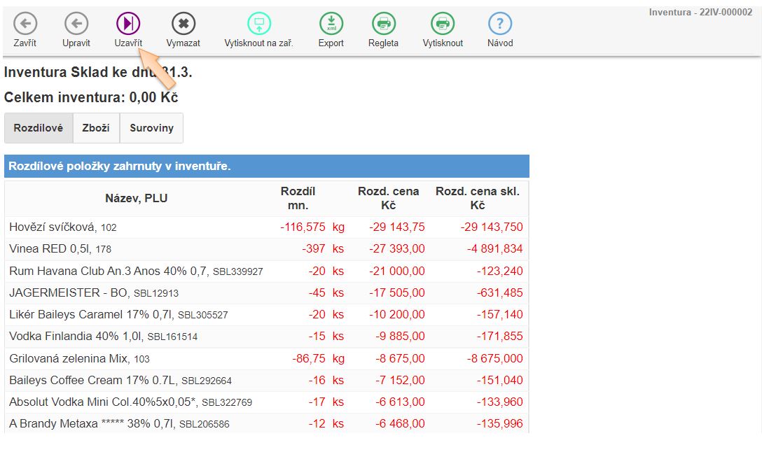 Systém na pozadí automaticky činí inventurní příjem, resp. pokud byl na položkách nějaký stav, udělá výdej, aby po vypořádání byl stav na kartách 0. Po nahození dokladů od dodavatelů do systému, doporučujeme provést inventuru se skutečným počtem skladových zásob.