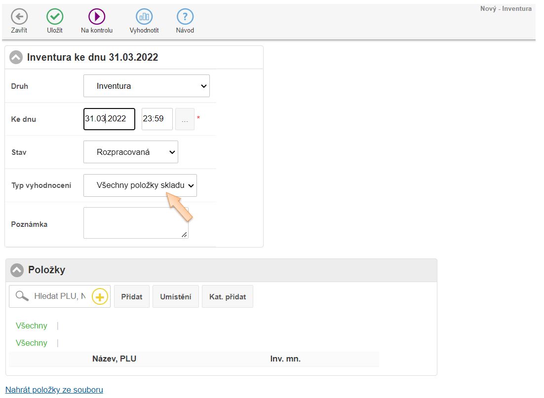 • Pozor, aby inventura vynulovala všechny položky, je třeba mít správný Typ vyhodnocení - Všechny položky skladu.
