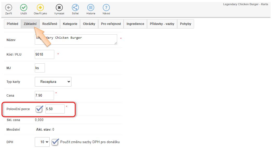 V případě skladové evidence a receptur, bude z jednotlivých surovin při prodeji poloviční porce odepsáno poloviční množství. V případě, že k výrobě poloviční porce používáte jiná množství surovin nebo odlišné suroviny, doporučujeme si vytvořit samostatnou kategorii pro tyto porce a jednotlivé karty si nadefinovat samostatně.