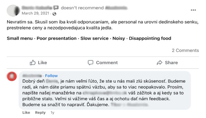 Ukázka reakce na negativní recenzi. Zdroj: Facebook