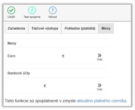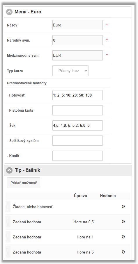 - Meny - definovanie meny a prednastavených hodnôt pre danú pokladňu a menu. Tieto hodnoty sa následne zobrazujú pri ukončovaní dokladu, kde si obsluha vie vybrať z jednotlivých platidiel pre úhradu.