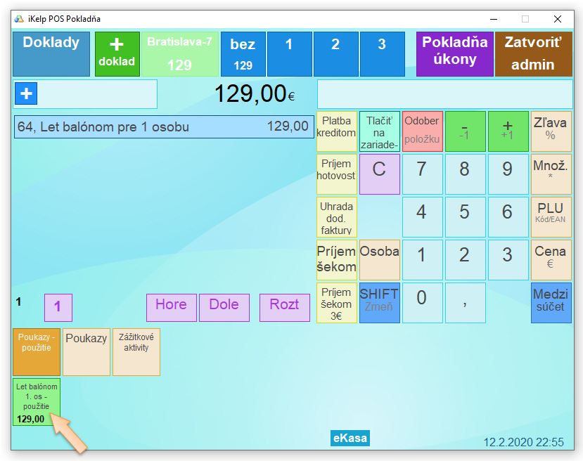 - V režime dotykového predaja vyberte kartu - poukaz zakúpený zákazníkom.