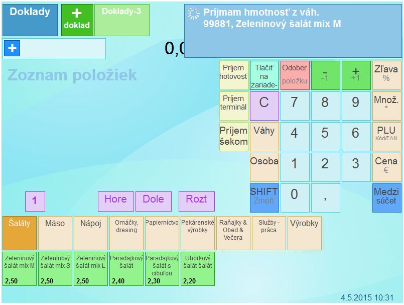 - Z celkovej hmotnosti sa automaticky po naúčtovaní položky odčíta hmotnosť obalu / misky.