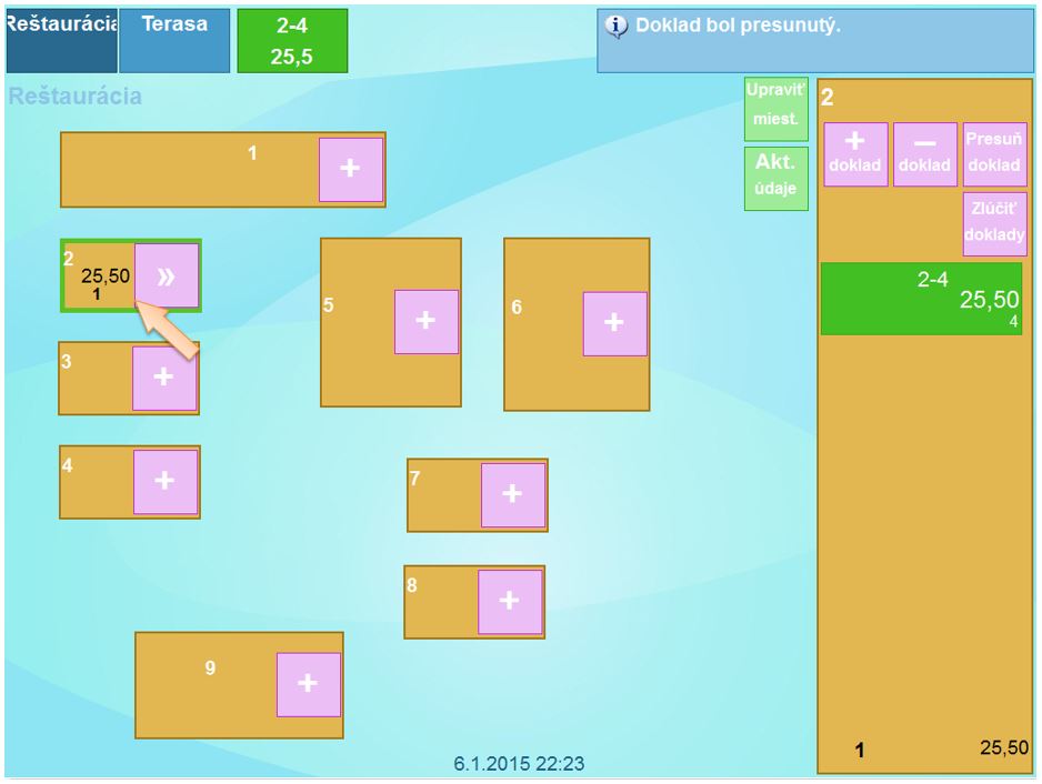 Potreba presunu účtu (dokladu) na iný stôl môže vzniknúť za rôznych okolností. Najčastejšie sa jedná o situáciu, že si zákazníci presadnú k inému stolu alebo sedeli na terase a z dôvodu zhoršenia počasia sa presunuli do vnútorných priestorov.