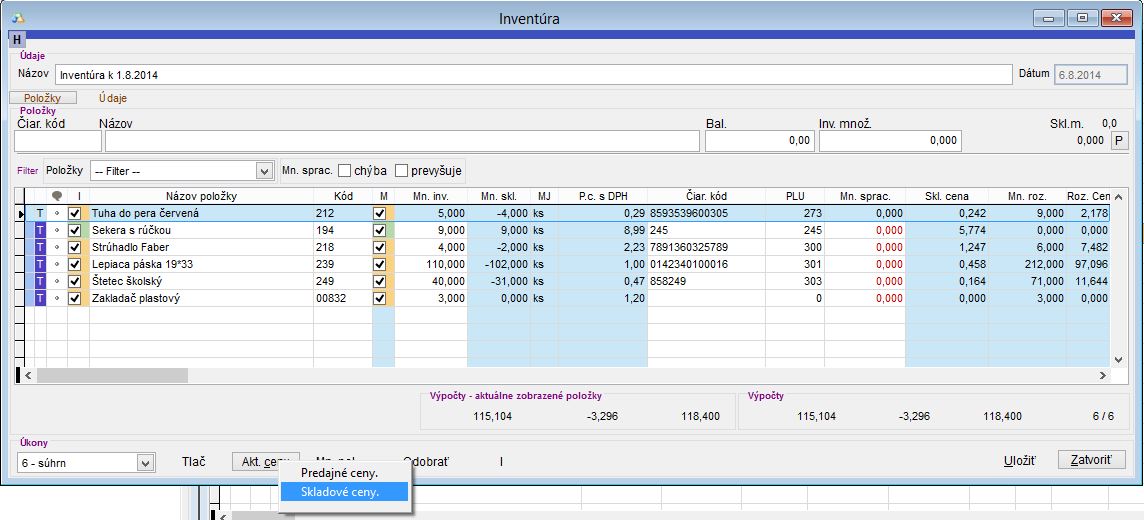 Ak už teda takáto situácia nastala a ceny na týchto skladových kartách ste skontrolovali a sú vyplnené, aktualizáciu skladových cien v inventúre vykonáte kliknutím na tlačidlo Akt. ceny -> Skladové ceny. (Na základe tejto operácie dôjde k opätovnému natiahnutiu skladových cien z kariet). Pozor, v tomto prípade dôjde k aktualizácii všetkých kariet k aktuálnemu dátumu. Ak teda došlo na sklade k pohybu na karte medzi tým, čo bola položka pridaná do inventúry a uzatvorením inventúry a pri tomto pohybe došlo k úprave skladovej ceny na karte, táto sa odzrkadlí aj v inventúre.