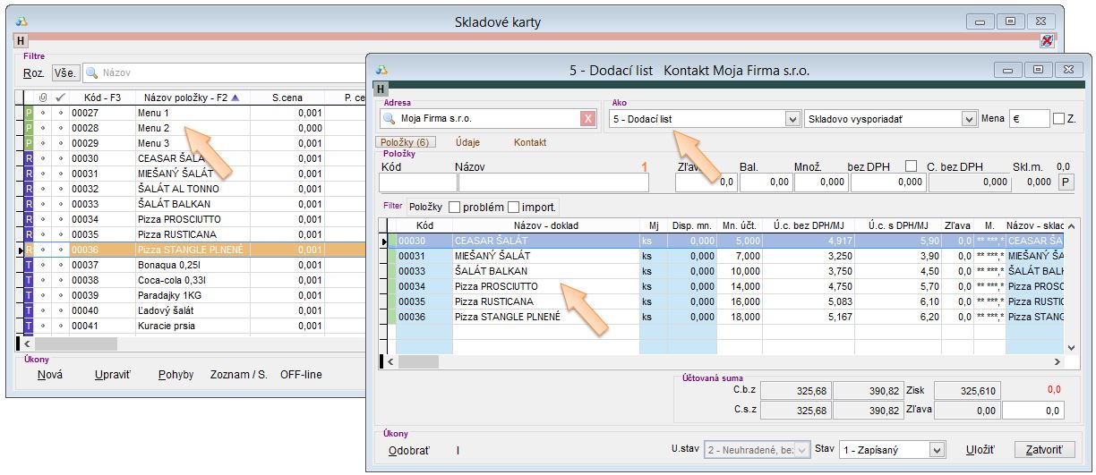 - Vytvorením dodacieho listu s nahodením konkrétnych jedál, podľa počtov predaného denného menu. Týmto sa zabezpečí odpis jedál zo skladu.