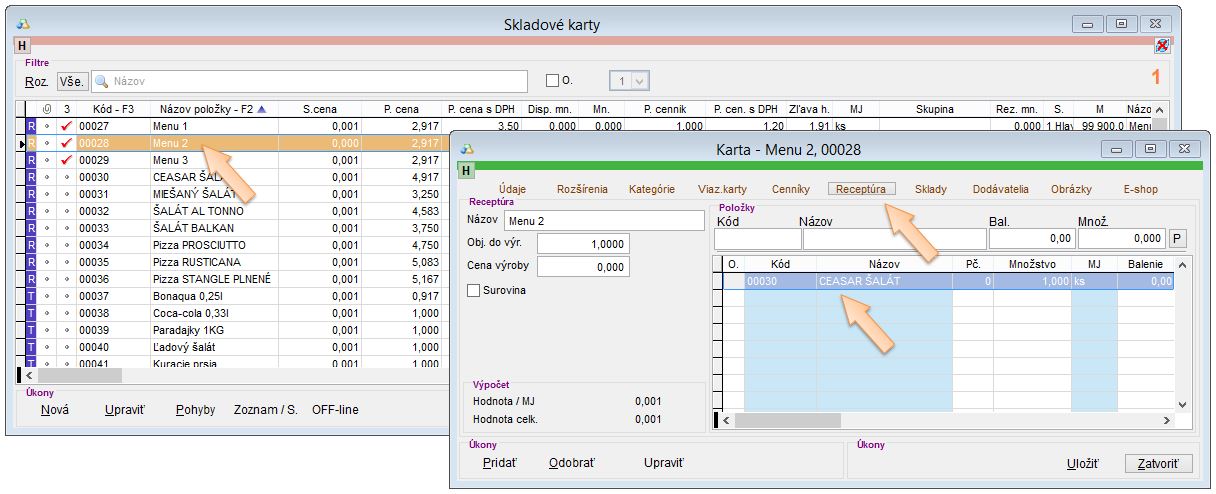 - Jednotlivé jedlá sú v aplikácii definované ako karty typu "Receptúra", na ktoré sú naviazané jednotlivé suroviny. Denné menu sa ale eviduje na kartách typu "Práca" a len na základe predaných množstiev sa pomocou dodacieho listu odpíšu jednotlivé jedlá zo skladu. Pri vysporiadaní výroby (Uzávierke receptúr) sa odpíšu všetky suroviny zo skladu na základe denného predaja. (Predávajú sa jedlá, ktoré evidujú odpis zo skladu pomocou výroby. Pri predaji denného menu sa eviduje počet predaných kusov, ktorý sa pripočíta pomocou dodacieho listu k predajom jedál. Následne sa vysporiada sklad pomocou výroby.)