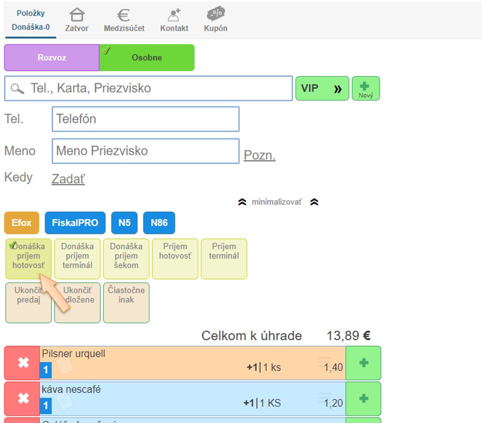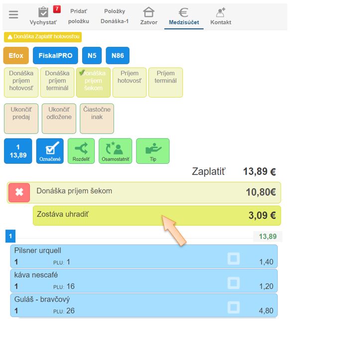 - Kliknite na ikonu platidla pre doplatenie zvyšnej sumy, napr. Príjem hotovosť.
