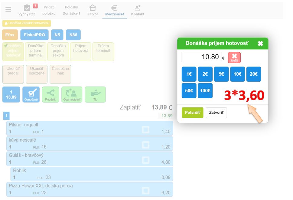 - Zadajte hodnotu platidla (bankoviek / šekov) pomocou klávesnice, kliknite na * a zadajte ich počet. Aplikácia automaticky dopočíta hodnotu.