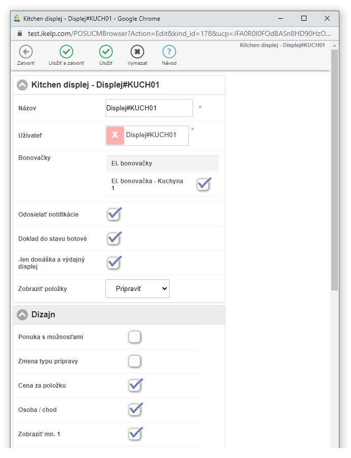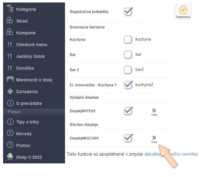 • Bonovačky - výber elektronických bonovacích tlačiarní, ktoré sa budú zobrazovať na displeji. Ak je v kuchyni viacero pracovísk je možné pri elektronickej bonovačke tak ako pri klasickej definovať, kde sa bon po pridaní jedla do objednávky vytlačí resp. zobrazí. Pre aktiváciu elektronických bonovacích tlačiarní kontaktujte pracovníkov technickej podpory na podpora(at)ikelp.com