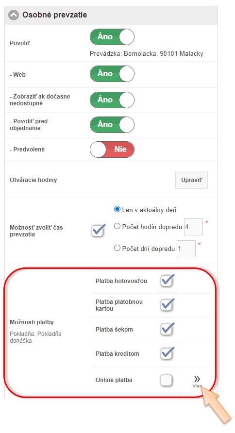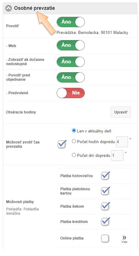 2. Prejdite do sekcie Osobné prevzatie, časť Možnosti platby.