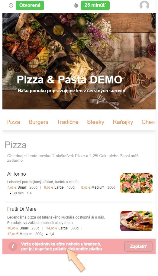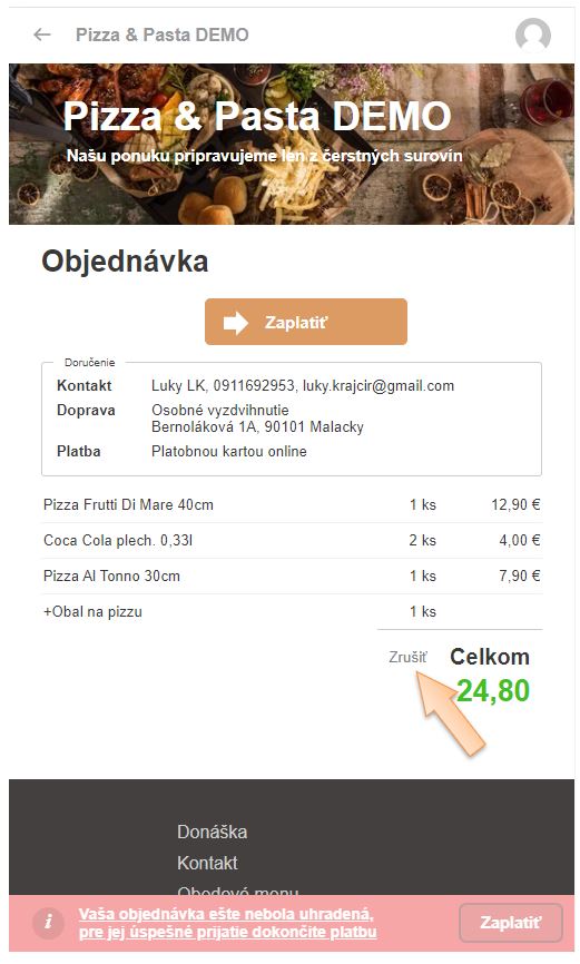 Tento návod je určený primárne pre zákazníkov, ktorí si objednávajú online v prevádzkach, kde je možné platiť online platobnou kartou. Môže nastať situácia, že zákazník objednávku vytvorí, ale z nejakého dôvodu následne neuhradí. Neuhradenú objednávku vie zákazník jednoducho zrušiť.