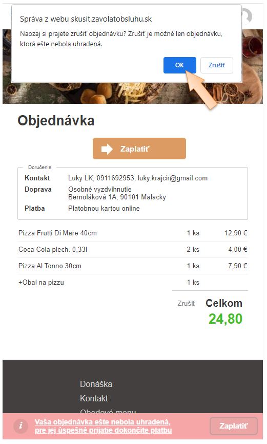 3. Potvrďte zrušenie objednávky v prehliadači kliknutím na OK.