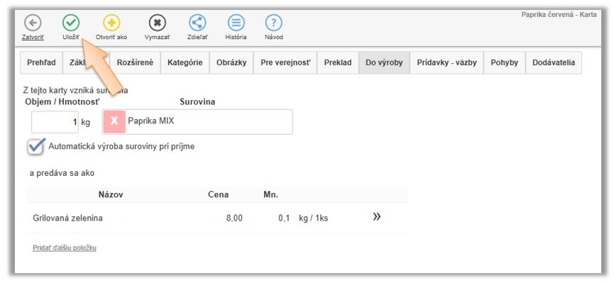 Tento scenár evidencie znovu opíšeme na príklade papriky. Dodávateľ na doklade účtuje papriku ako 1ks - Paprika biela debnička 10kg, ale aby systém vedel správne odpisovať surovinu definovanú v receptúrach, potrebujete to prijať rovno ako paprika biela 10kg. V tomto prípade sa tovar naskladňuje a eviduje na sklade v inej mernej jednotke a v inom počte ako je na doklade od dodávateľa.