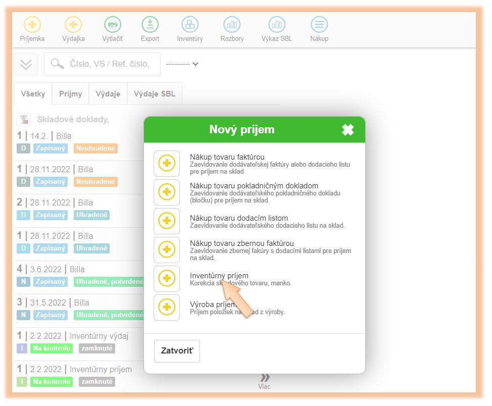 2. Vyberte možnosť + Príjemka a vyberte možnosť Inventúrny príjem.