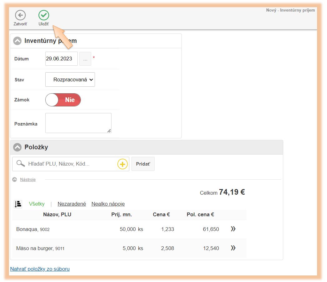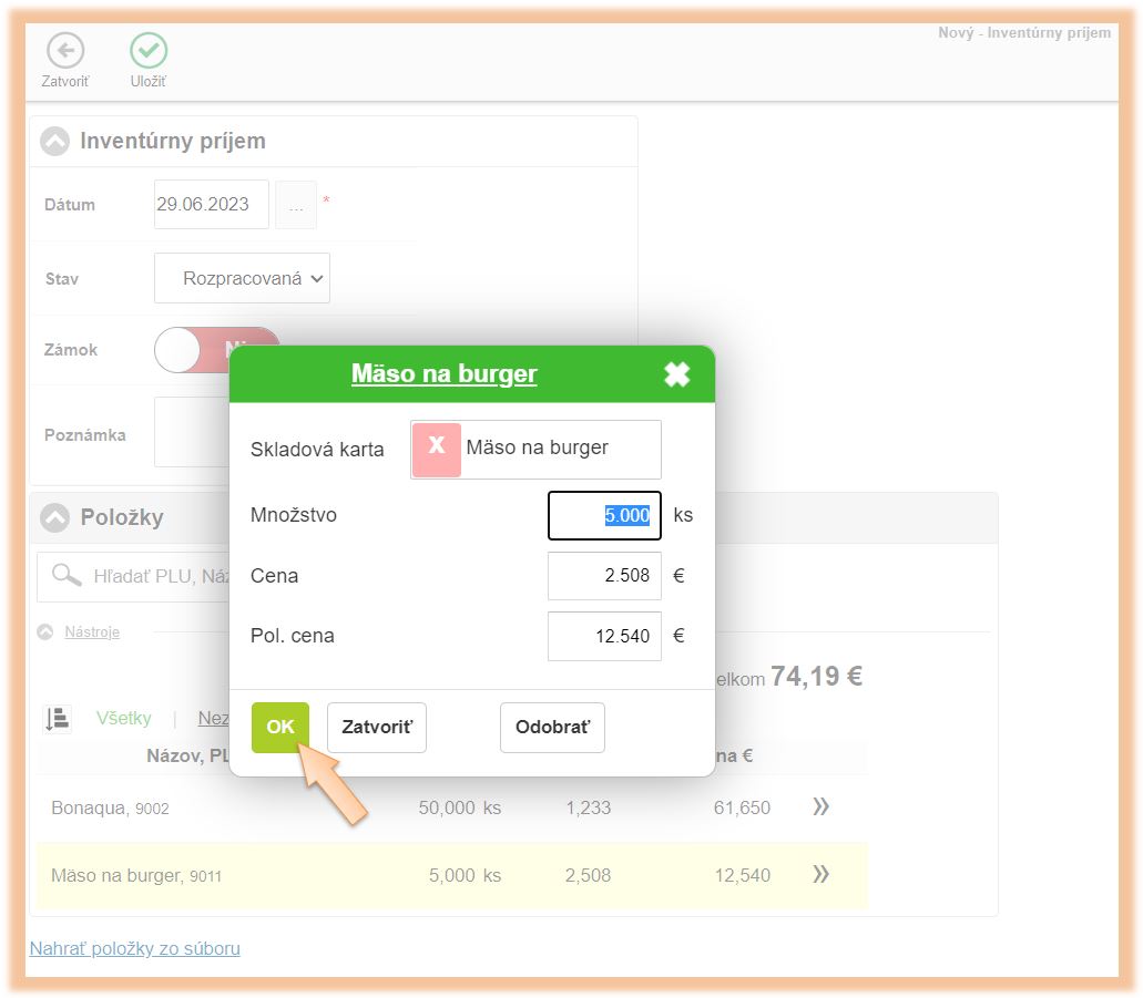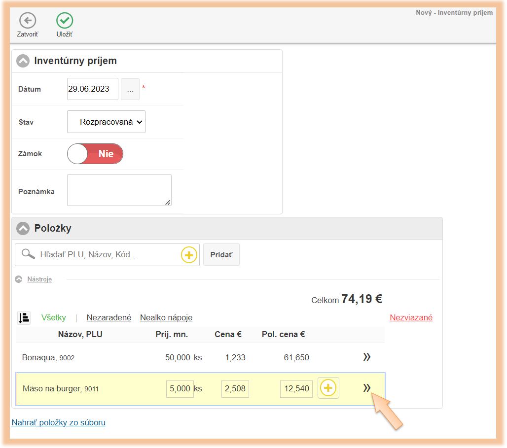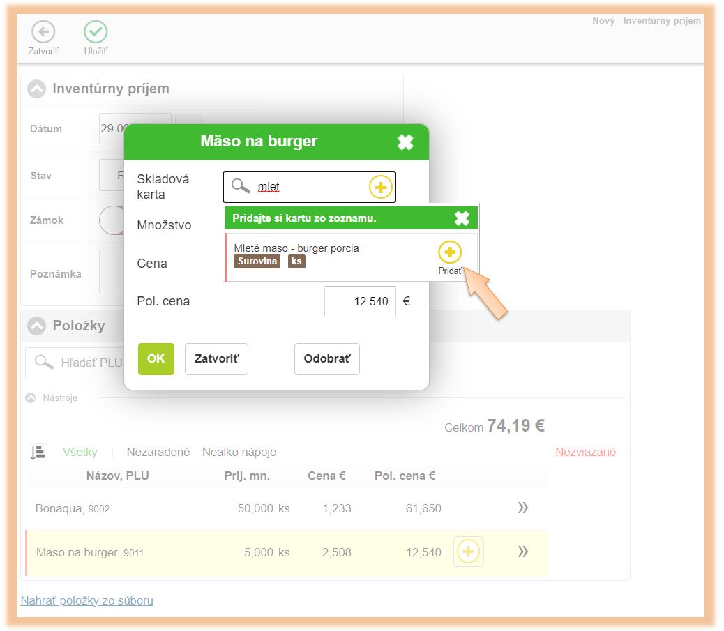 • Kliknutím na + je možné vytvoriť v systéme novú kartu, na ktorú sa tovar prijme.