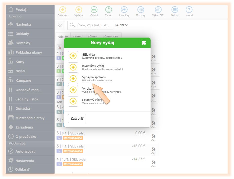 - V menu aplikácie Sklad kliknite na + Výdajka a vyberte Výdaj na spotrebu.