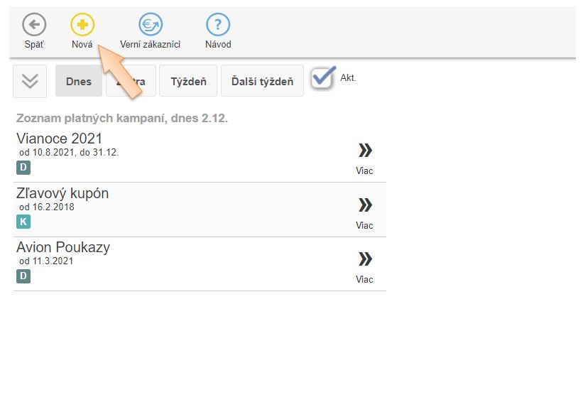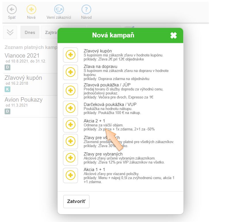 2. Klknite na tlačidlo + Nová a vyberte možnosť Kampaň - Akcia 2 + 1.