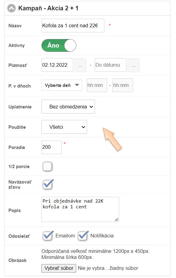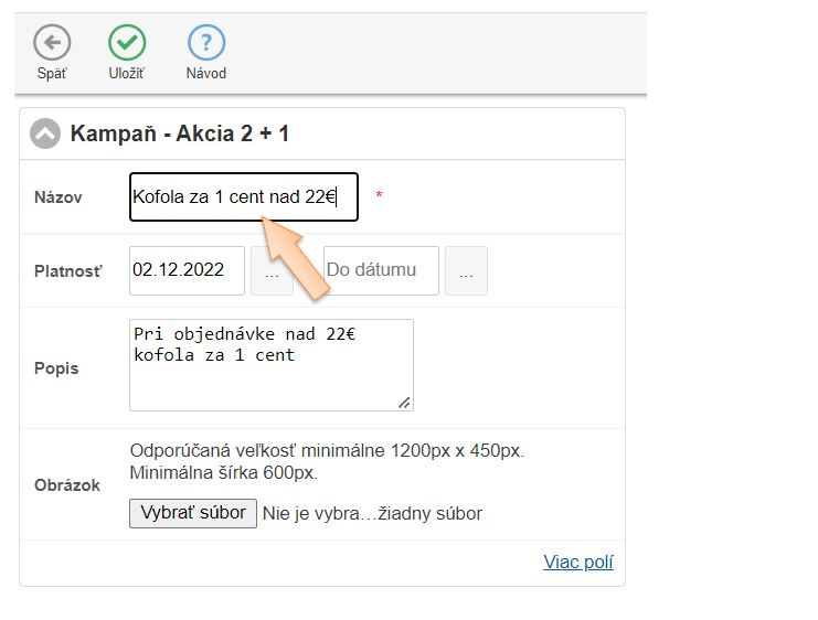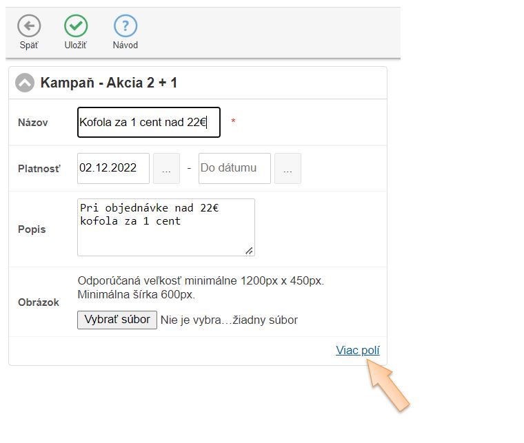 • Kliknutím na Viac polí je možné definovať rozšírené pravidlá kampane, ako uplatnenie, použitie alebo zadefinovať platnosť napr. konkrétny deň alebo hodinu.