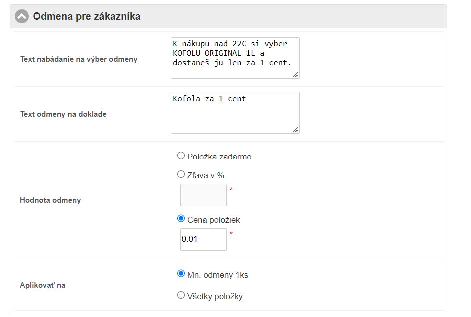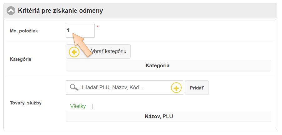 1. Do poľa Mn. položiek zadajte počet položiek, ktoré musia byť v objednávke pre získanie odmeny. V našom prípade to môže byť aj 1.
