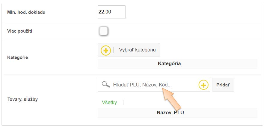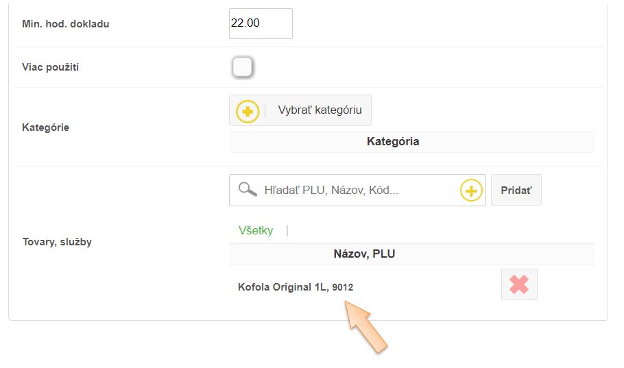 • Ak chcete umožniť výber rôznych položiek z ktorých bude poskytnutá zľava, je možné tieto pridať do zoznamu, alebo vybrať celú kategóriu napr. nealko nápoje. Následne sa akciová cena uplatní na poslednú pridanú položku z danej kategórie. Samozrejme je vhodné použiť správny popis, aby zákazník dostal presnú informáciu o možnosti využitia akciovej ceny.