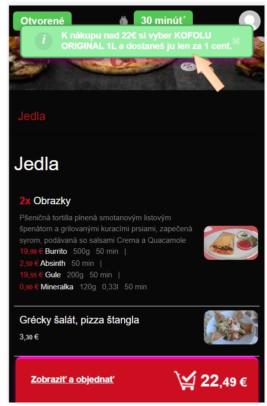 • V prípade, že by bola akciová cena za položku viazaná napr. len ku kategórii pizza, musela by hodnota objednávky zákazníka byť v hodnote 22€ z kategórie pizza. Ak by aj hodnota dokladu bola 22€ ale jednalo by sa o položky z iných kategórií, zákazník by nárok na zľavnenú položku nemal.